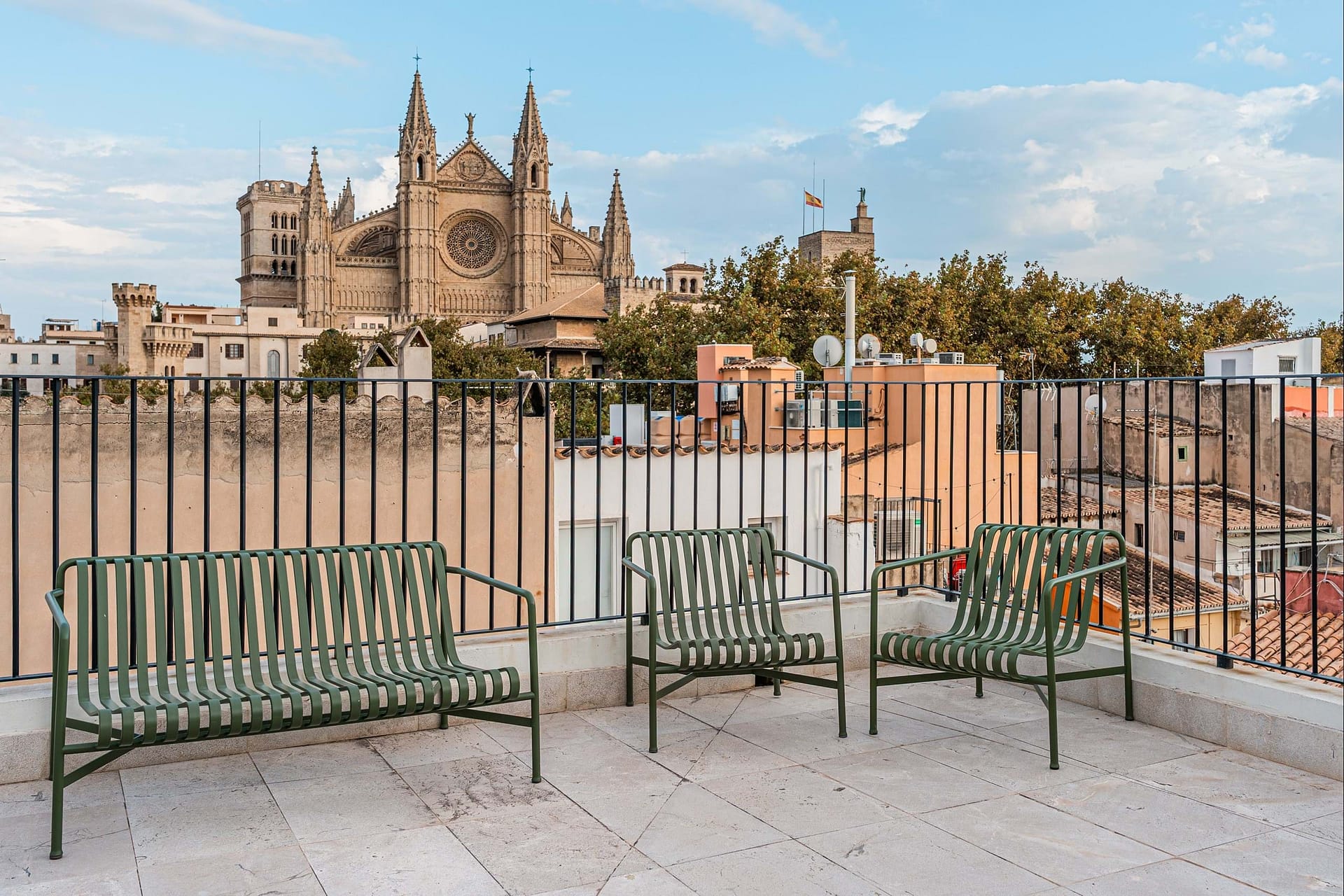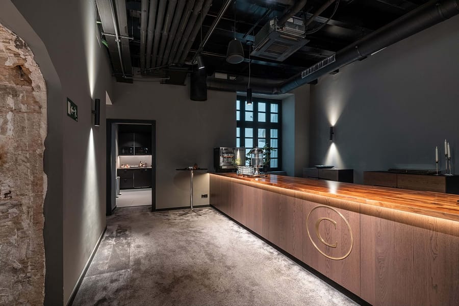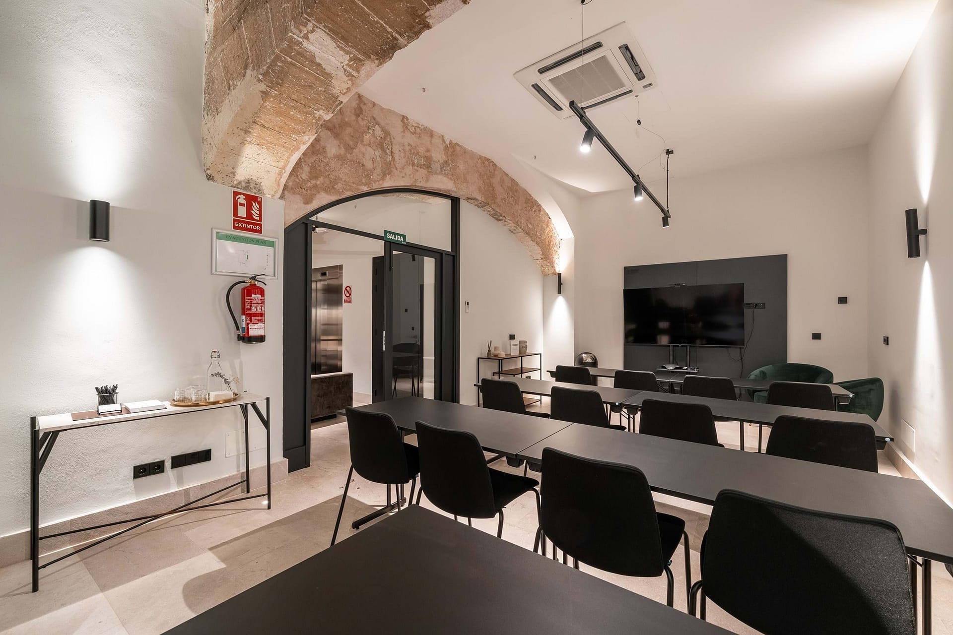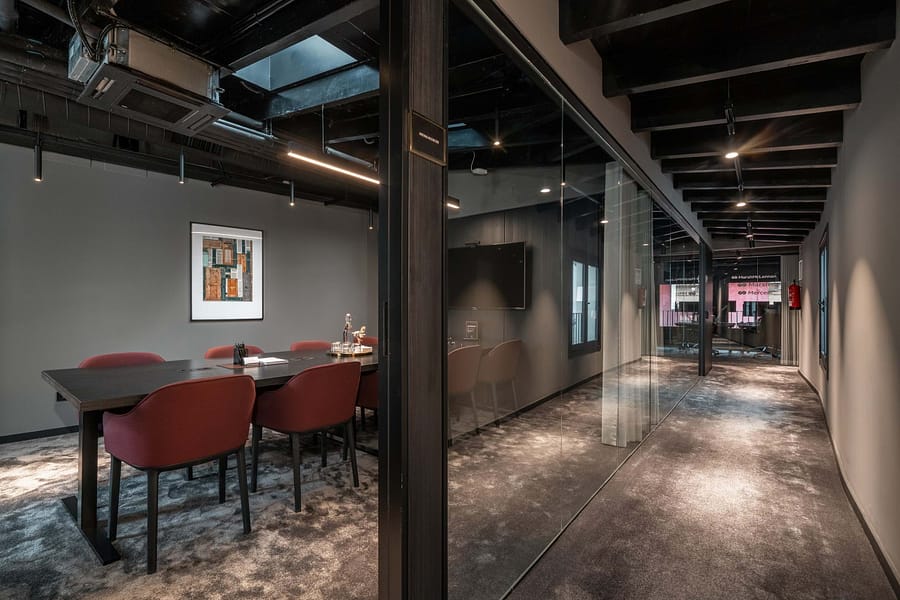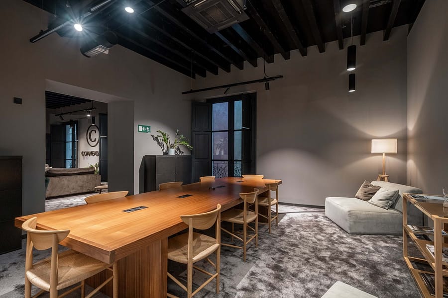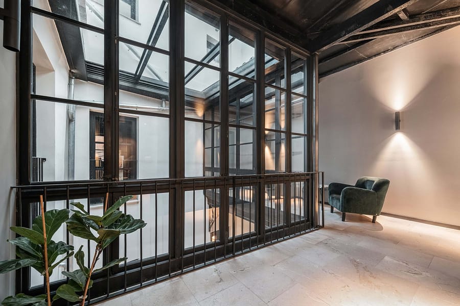 The property offers five floors of versatile spaces, including two expansive terraces, a bright glass-roofed courtyard, fully equipped kitchens, elegant lounge areas, and modern meeting rooms. A stunning rooftop terrace provides panoramic views of the Cathedral and is complemented by an additional smaller terrace, creating a unique and captivating feature.