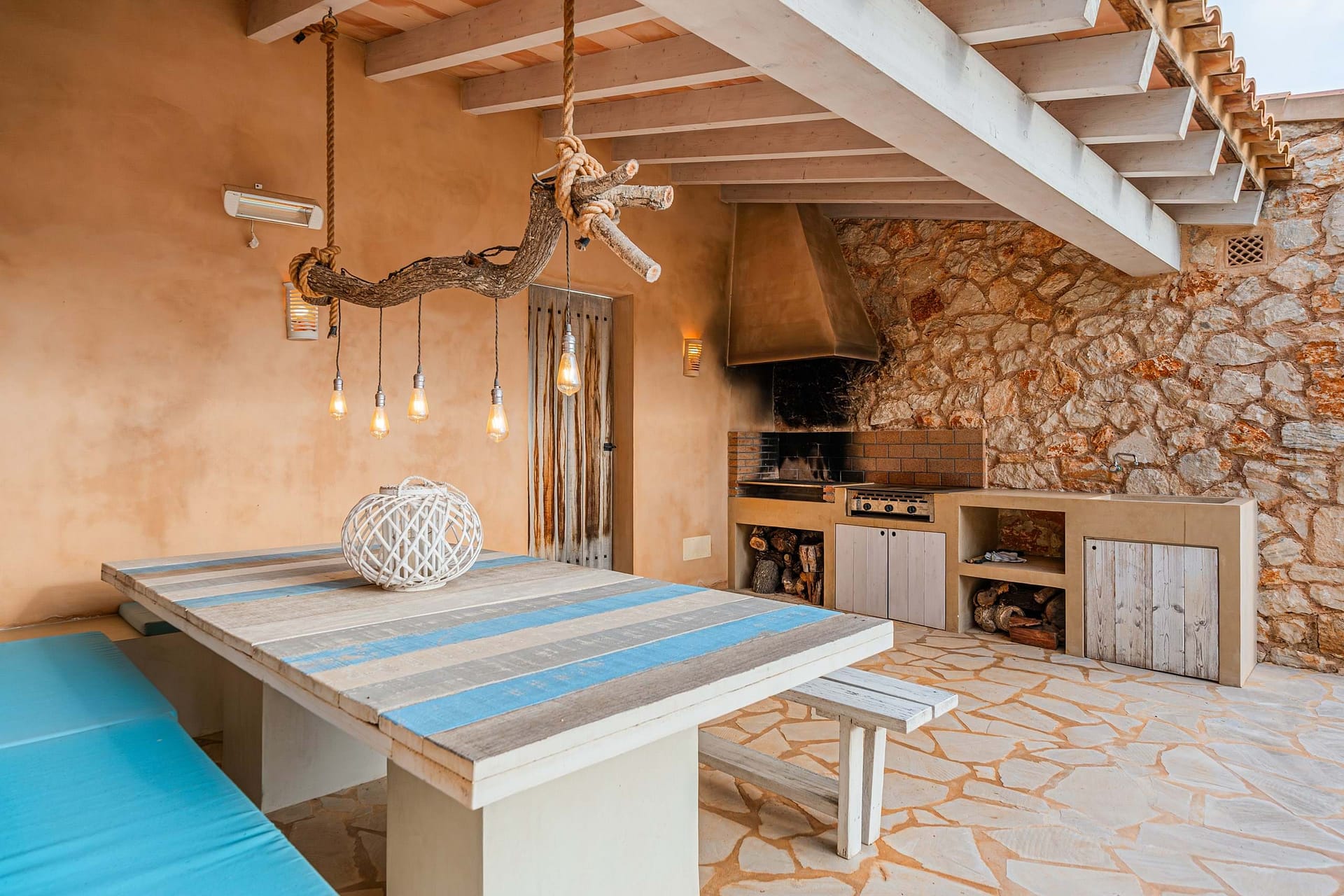 Set between Santanyí, SAlqueria Blanca, and Cala Mondragó, this private Mediterranean estate offers nearly 600 m² of living space on 2 hectares of landscaped land, fully hidden from view for complete privacy. Built in 2015, the villa welcomes you through a traditional patio into a bright, open living-dining area with an integrated kitchen featuring sealed oak carpentry and seamless access to a southeast-facing terrace. The exterior includes a 63 m² swimming pool, sun terrace, lush Mediterranean garden with palms and lavender, a boules court, outdoor fireplace, and a microcement outdoor kitchen, along with a charming guest casita with sauna. Doors and frames throughout the property are crafted in elegant Iroko teak African wood, adding warmth and refined craftsmanship. The ground floor also includes two guest suites with en-suite bathrooms, a utility room, guest WC, and storage.