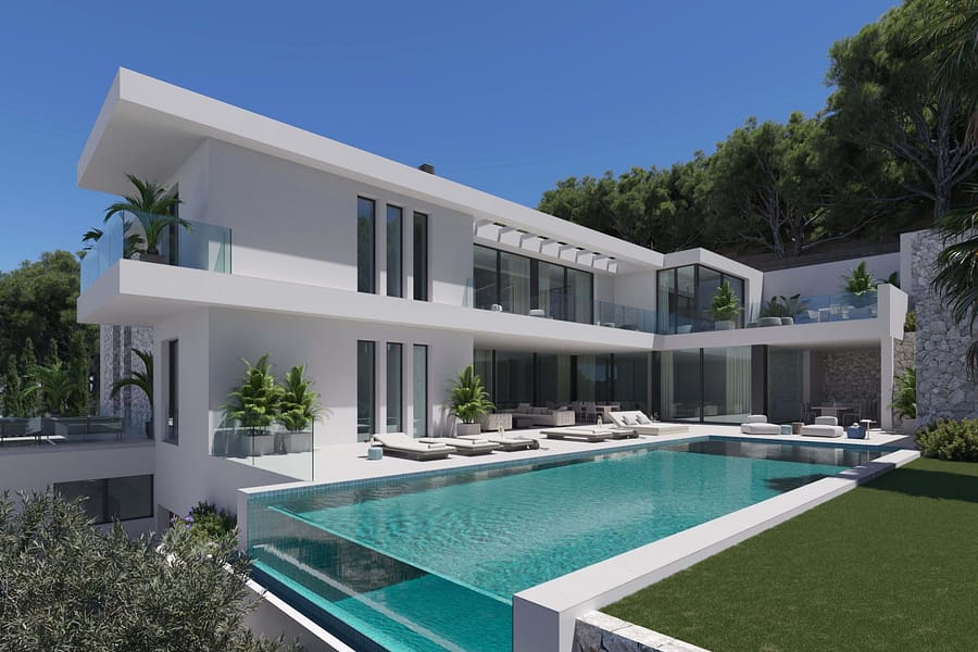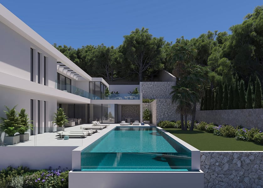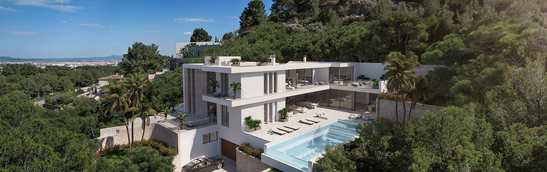 Discover an exceptional opportunity to acquire a substantial and high-quality plot situated in a wonderfully natural setting within Son Vida, often referred to as “the Beverly Hills of Mallorca,” in the Ponent District. This offering includes the expansive 3,274 m² plot, an existing architectural project, and the granted municipal license to begin construction on a significant three-level villa with a roof terrace. The planned residence offers a generous total constructed surface of 937 m², featuring a two-car garage plus ample outdoor parking for four additional vehicles, six bedrooms, seven bathrooms, and a guest toilet. The technical specifications highlight robust concrete basement and retaining walls, insulated three-layer exterior walls with options for natural stone or sleek plastered and painted finishes, high-class dark grey aluminum Cortizo windows, elegant room-high white doors and cupboards with concealed fittings, and beautiful Binissalem marble flooring extending throughout the interior and exterior terraces. Comfort and luxury are ensured with underfloor heating and a high-quality heat pump air conditioning system in all rooms, complemented by design lighting and sophisticated bathrooms featuring Binissalem marble, Dornbracht and Duravit sanitary ware, integrated glass banisters, and a saltwater overflow pool. This represents a rare chance to build a grand and well-appointed estate on a large plot in a sought-after Son Vida location with all necessary permissions secured. For those seeking a larger estate or development potential, all three neighboring plots are available as a combined purchase for 4.2 million euros.