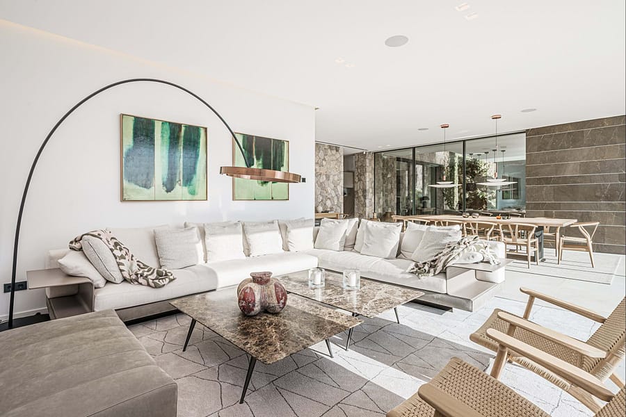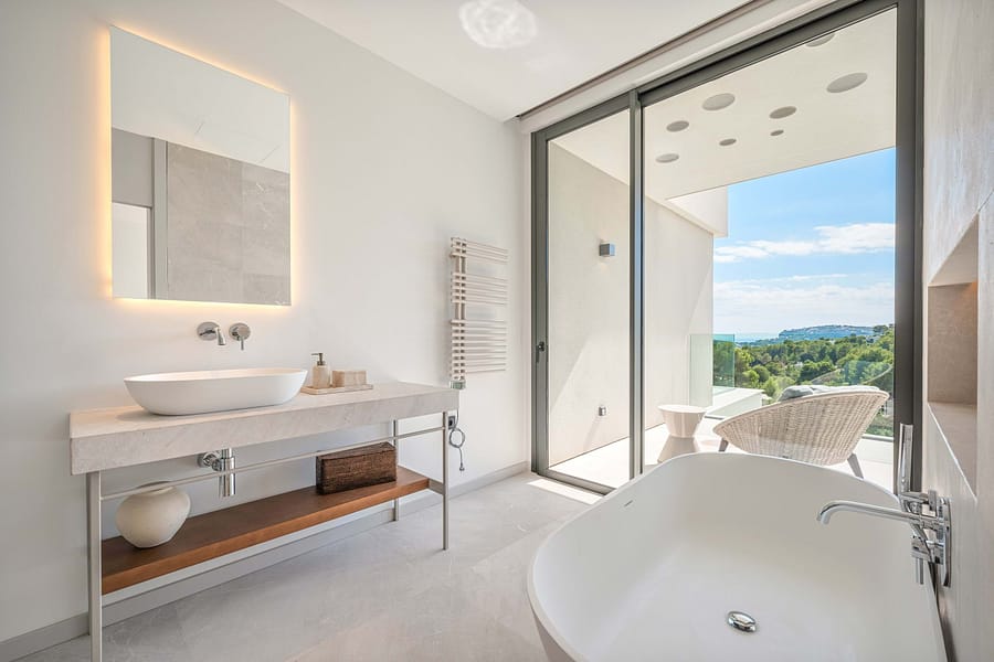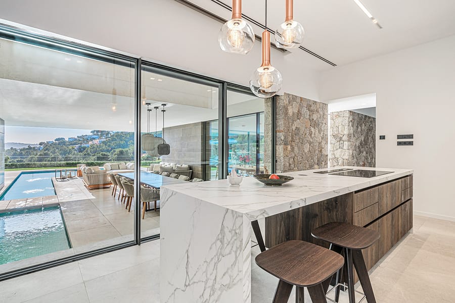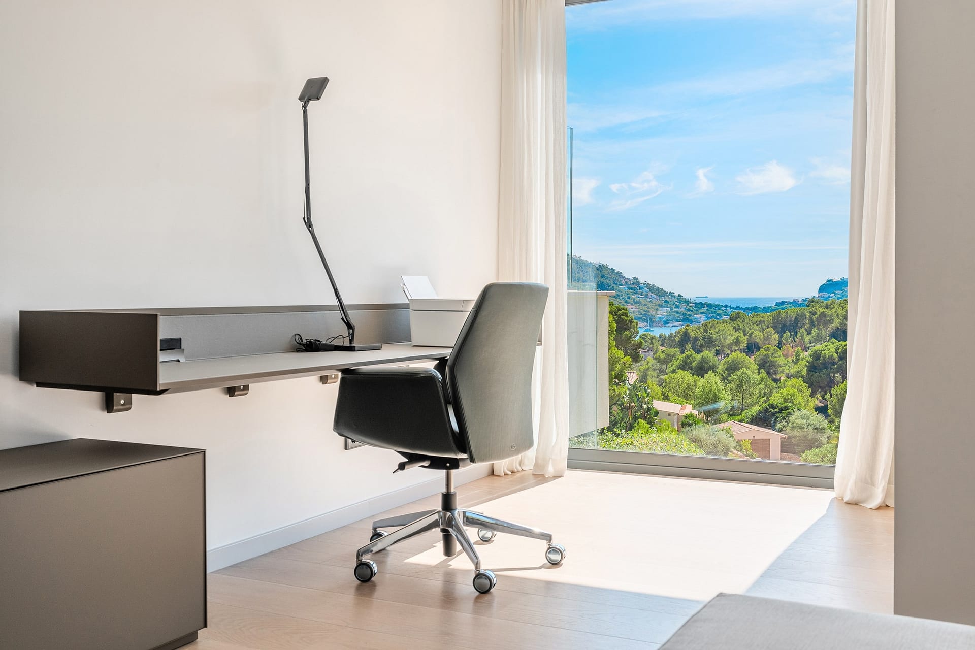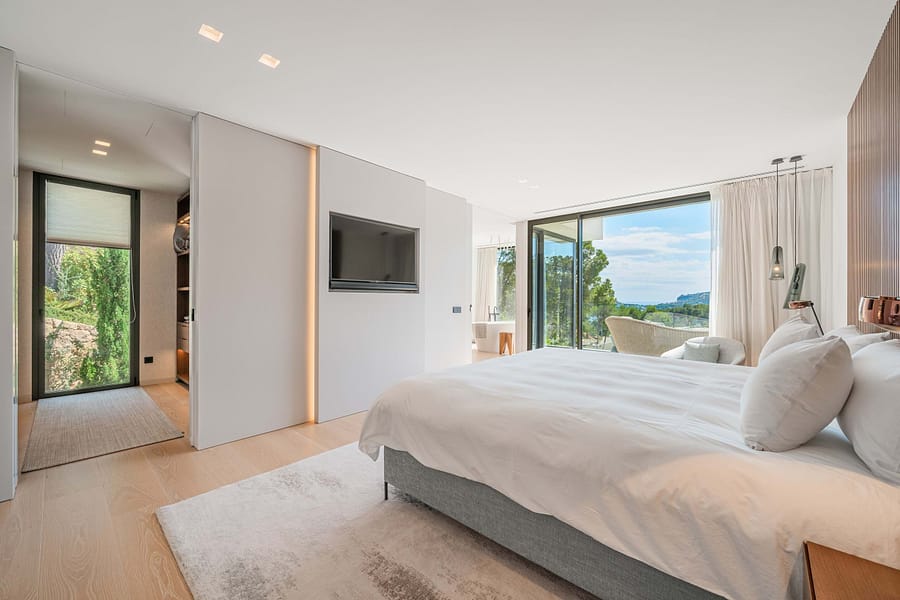Inside, the five spacious bedrooms each have luxurious en-suite bathrooms and generous built-in-wardrobes. The master suite offers a king-size bed, a spa-like bath, and a private terrace overlooking the coastline. The sophisticated kitchen is fully equipped with premium appliances, generous counter space, and a central island, making for a sleek and functional design. Premium features include an elevator, wine cellar, fully equipped gym, and a double garage with an electric charger.