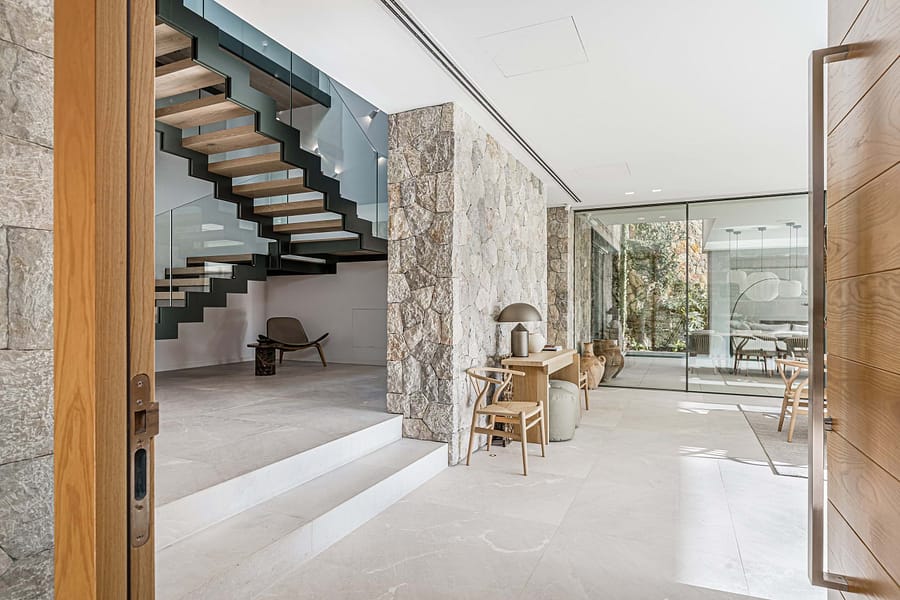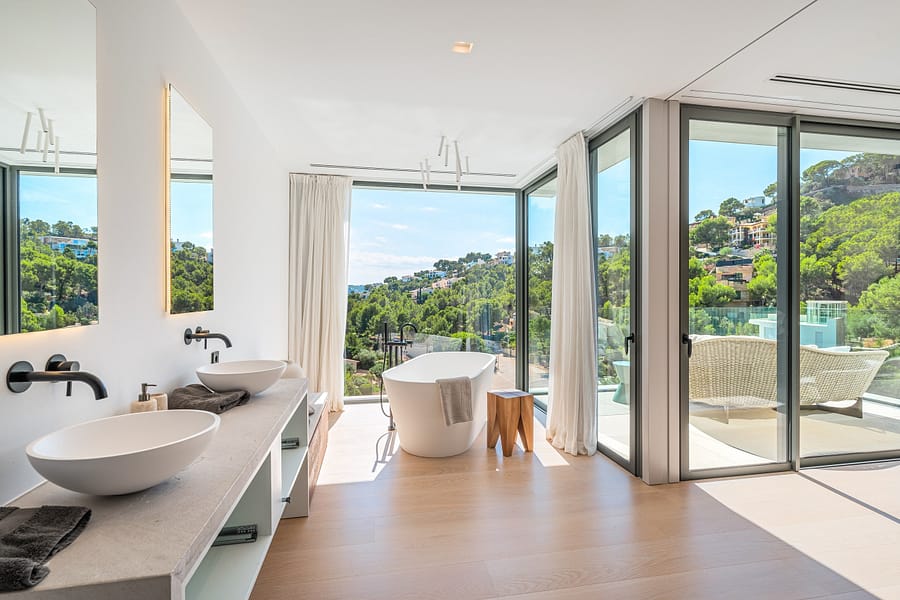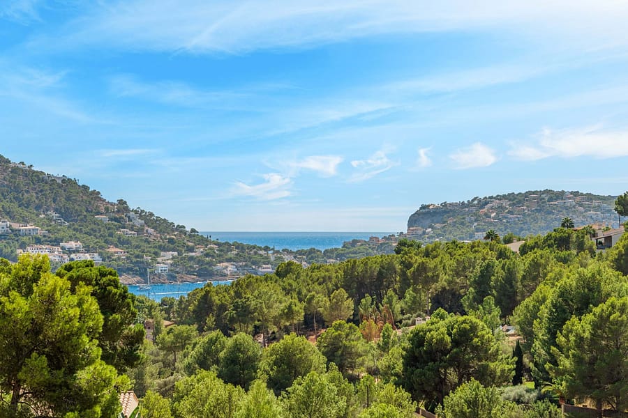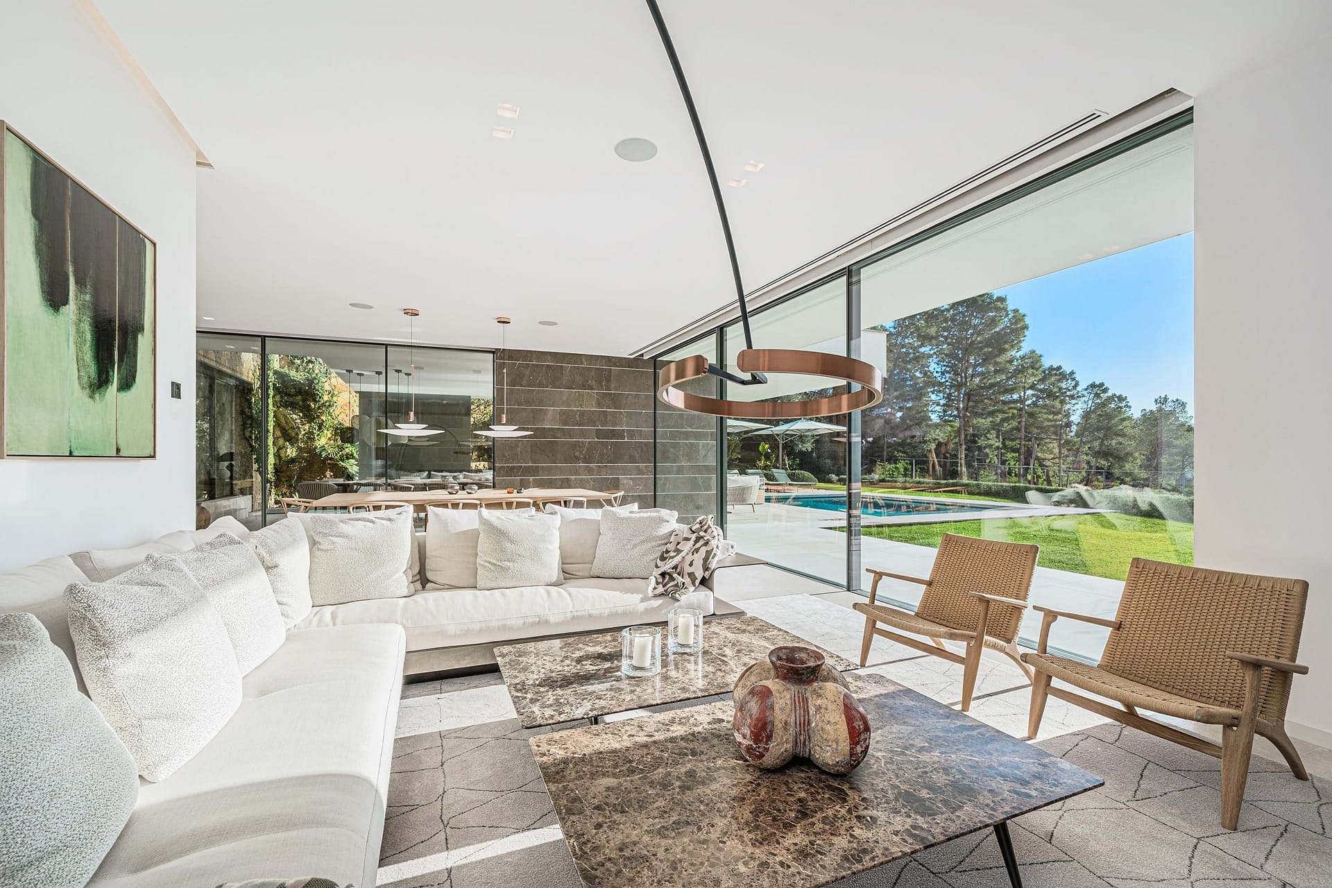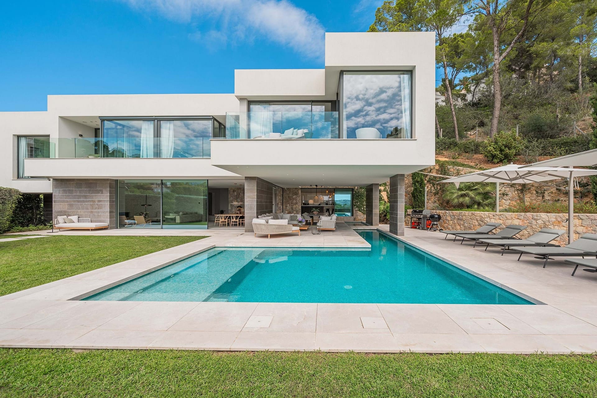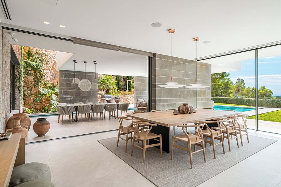 The outdoor spaces are just as impressive, with a large infinity pool perfectly positioned to capture the sunset. Multiple terraces provide ideal settings for lounging and entertaining, while the expansive landscaped Mediterranean gardens offer privacy in a green, calming environment. An outdoor kitchen and dining area make open-air gatherings effortless. Situated on a spacious flat plot, the property provides a rare combination of seclusion and proximity, with the vibrant Port of Andratx just a short stroll away.