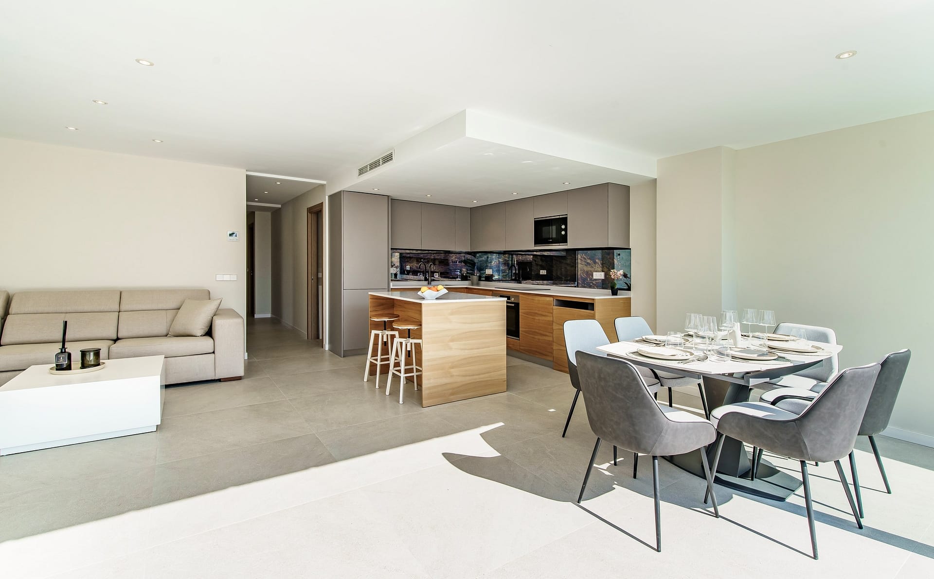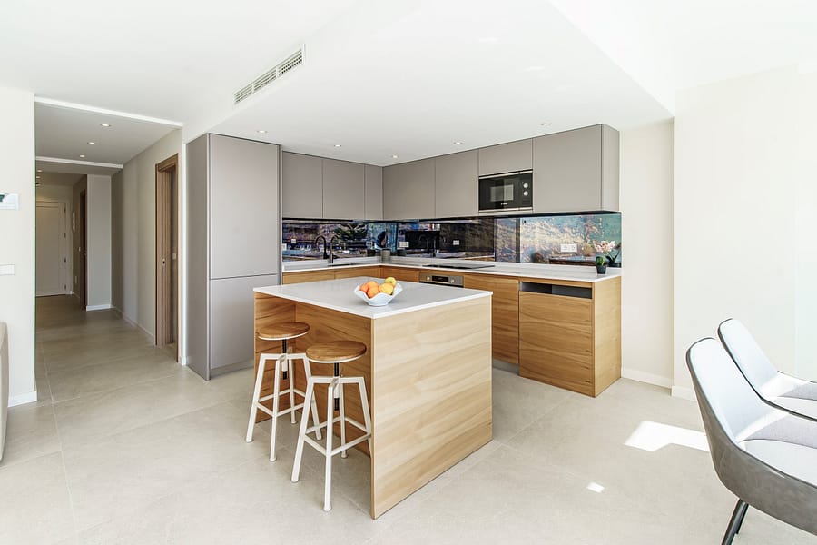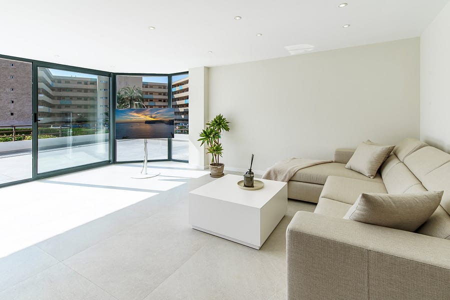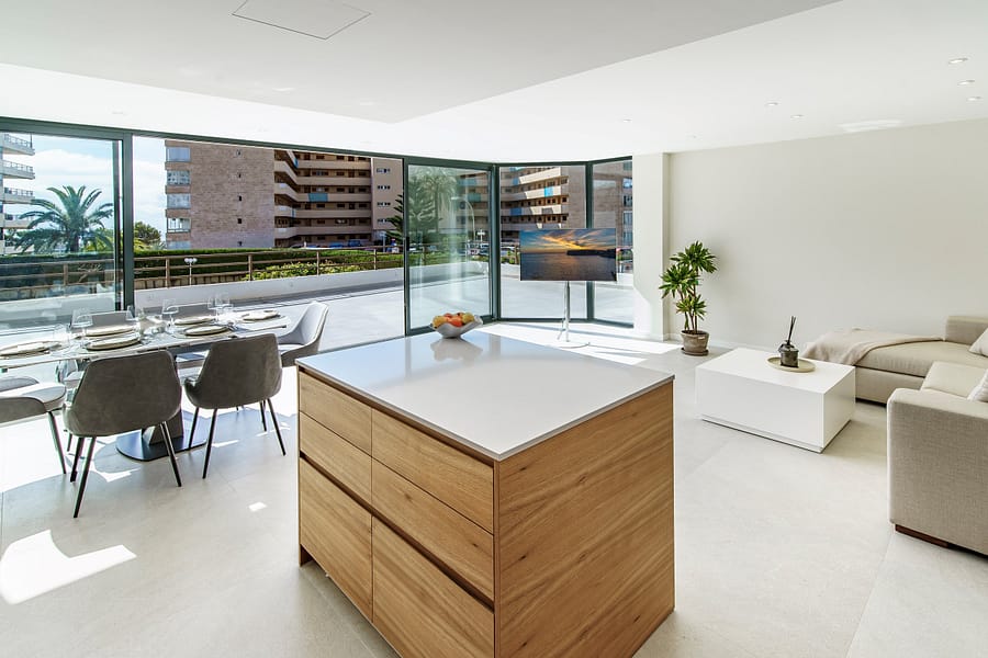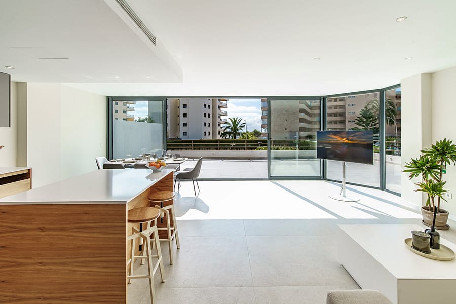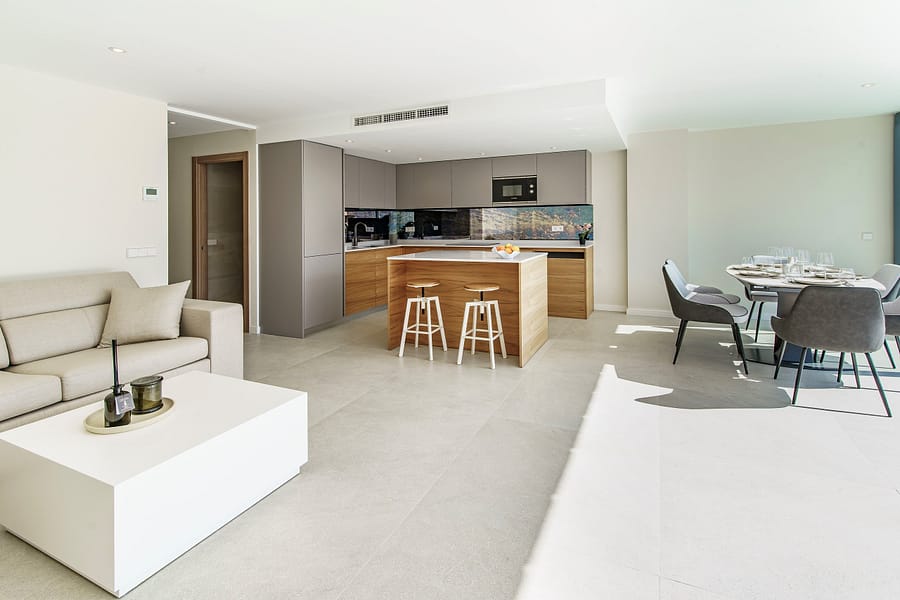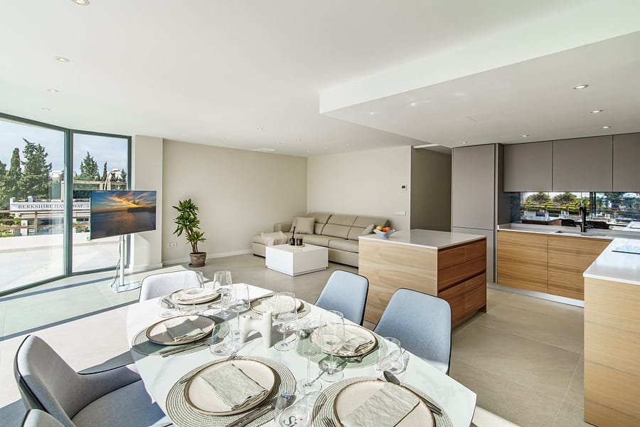 The apartment offers a bright and modern open-plan living and dining area with a fully fitted kitchen, creating a contemporary and comfortable living space. With two spacious bedrooms and two modern bathrooms, this property is perfectly suited as a holiday apartment in Mallorca, a permanent residence, or a high-demand investment property in Portals Nous.