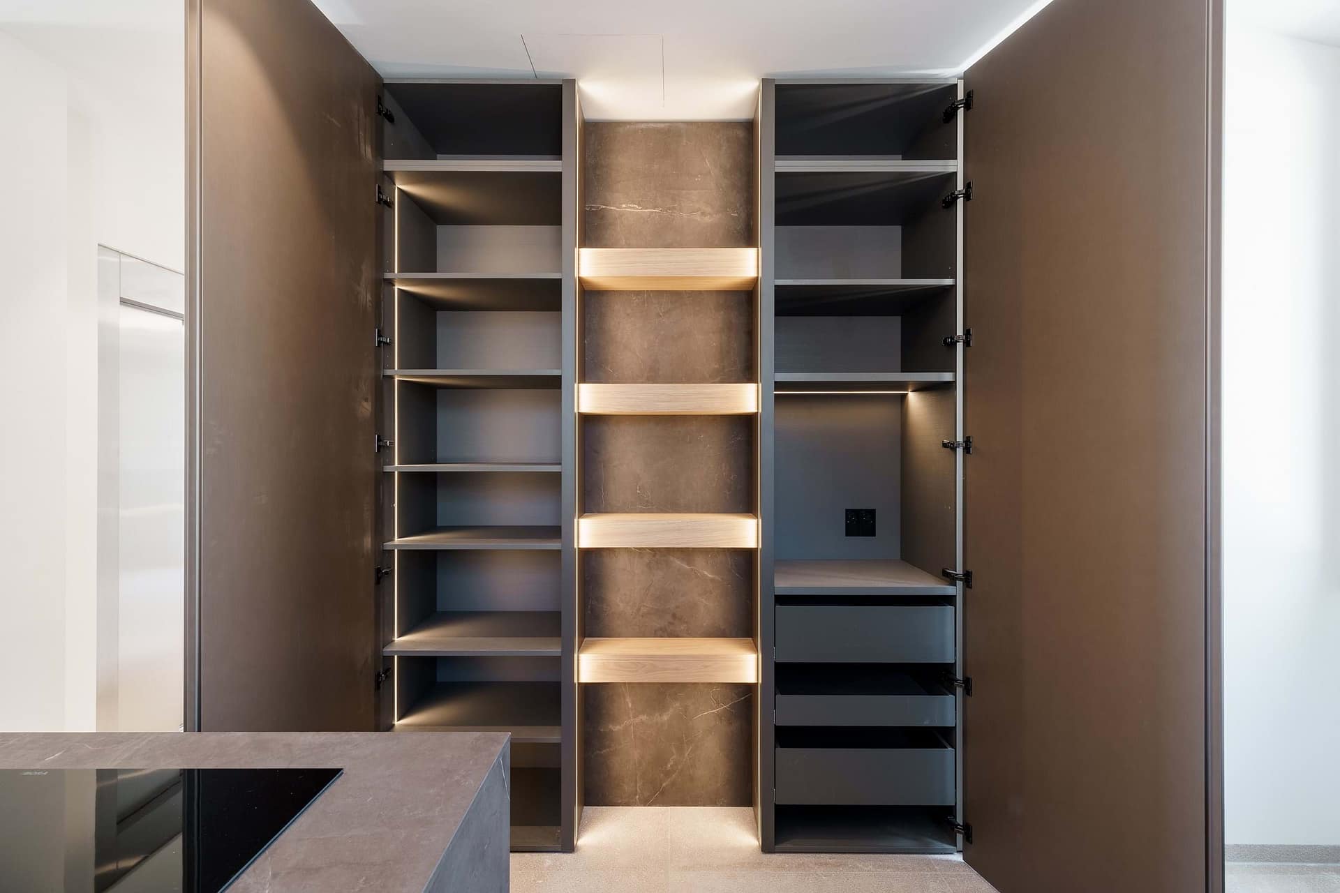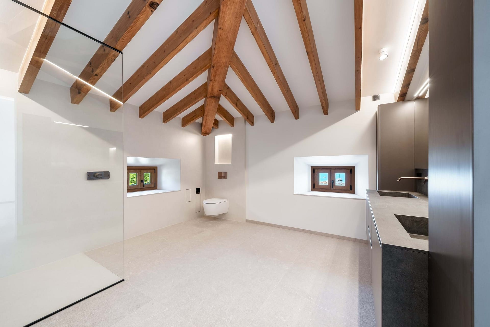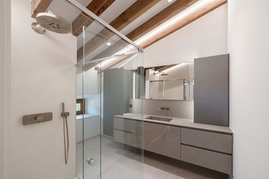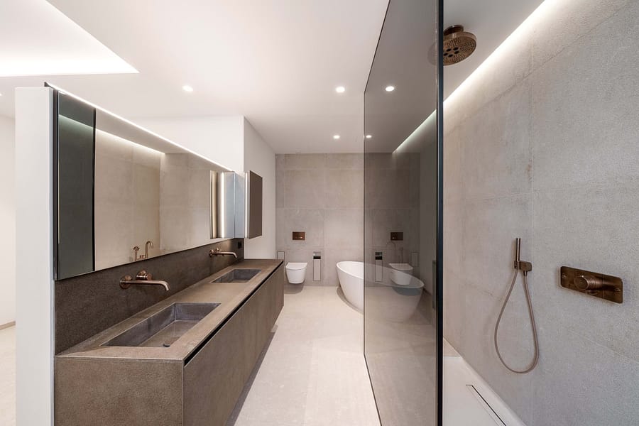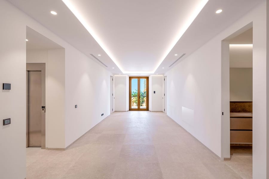 Modern amenities include a sauna, underfloor heating, air conditioning, and a dedicated library or wine lounge, complemented by an elevator providing seamless access to all levels. The villa also prepares for solar energy integration, ensuring sustainability.