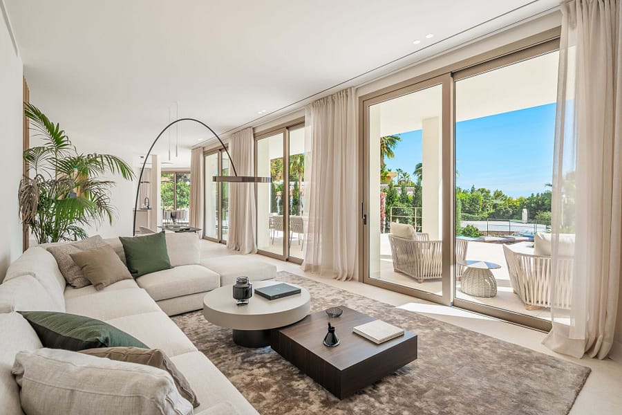 This is a newly-built villa in Bendinat, Mallorca, which boasts a beautiful sea view. It has four bedrooms and covers an area of 6,932 square feet. The villa has been designed to receive as much natural light as possible, giving it a warm and inviting ambiance. Large bay windows open onto the exterior and a landscaped garden provides privacy. The villa has three levels, all connected by an elevator. The first level features a wellness area with a gym, sauna, and bathroom. It also has a wine cellar and a garage that can hold up to three cars. The second level has a spacious living room with a fully-equipped modern kitchen, opening onto a terrace for outdoor dining. It also has a beautiful pool area surrounded by lush plants, perfect for relaxation. A master suite is also found on this level. The third level is devoted to the sleeping area, which has three bedrooms with en suite bathrooms and dressing rooms. The vast master suite opens onto a terrace with a magnificent view, and an even more stunning view can be enjoyed on the roof terrace. The villa is made of high-quality materials and has air conditioning, a saltwater infinity pool, and a wellness area. It is sold fully equipped and furnished. The villas location is strategic, with quick access to the Puerto Portals marina, known for its luxury boutiques, restaurants, and nightlife. The city of Palma is less than 15 minutes away and has a fast pace of life. The airport is also only 20 minutes away. The villa is surrounded by some of the worlds best golf courses, each with unique scenery and views. With this villa, you can enjoy the Mediterranean way of life on one of the most beautiful islands in the world.
