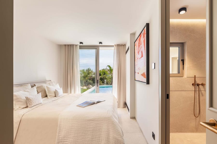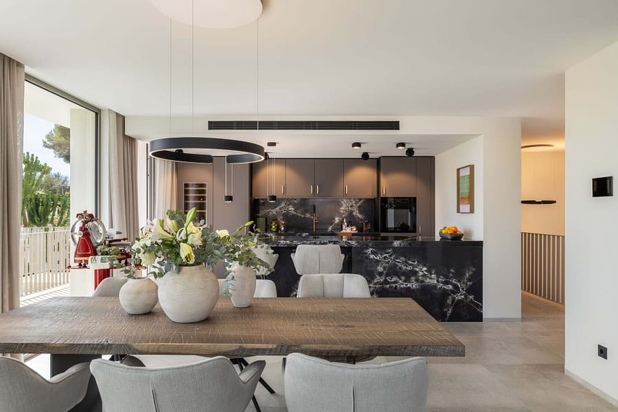 Discover the epitome of luxury living in this meticulously reformed villa, Casa Nadala. Nestled in the sought-after area of Palmanova, this exquisite property combines modern elegance with a serene Mediterranean lifestyle. Originally constructed in 1988 and completely reformed in 2024, this villa offers approximately 298 sqm of living space on a generous plot of around 955 sqm. The villa features 4 spacious bedrooms and 4 en-suite bathrooms, along with an additional guest bathroom, providing ample comfort for family and guests. Experience year-round comfort with state-of-the-art underfloor heating and warm/cold air conditioning. The gourmet Birgit Mller kitchen is a chefs dream, equipped with high-end appliances and finishes, while elegant stone flooring (gris zarzi 80 x 80 cm) throughout adds sophistication to the interior. Step outside to your private oasis, where a stunning pool measuring approximately 39 sqm invites you to bask in the sun or take refreshing dips. The expansive outdoor space, including approximately 98 sqm of terraces, offers the perfect setting for alfresco dining and entertaining, all while enjoying part-sea views that enhance the tranquil ambiance. This villa is equipped with a comprehensive KNX home automation system and an advanced alarm system for modern living. A dedicated cinema room provides the ultimate movie-watching experience, while premium lighting fixtures from Occhio and high-quality sanitary facilities from Iconico elevate the luxury feel. Furniture is not included in the purchase price but is available, allowing for a personalized touch in your new home. Casa Nadala is truly ready to move in, making it an ideal retreat for those seeking elegance and comfort in Mallorca. Dont miss the opportunity to own this exceptional villa. Contact us for more information or to arrange a private showing!