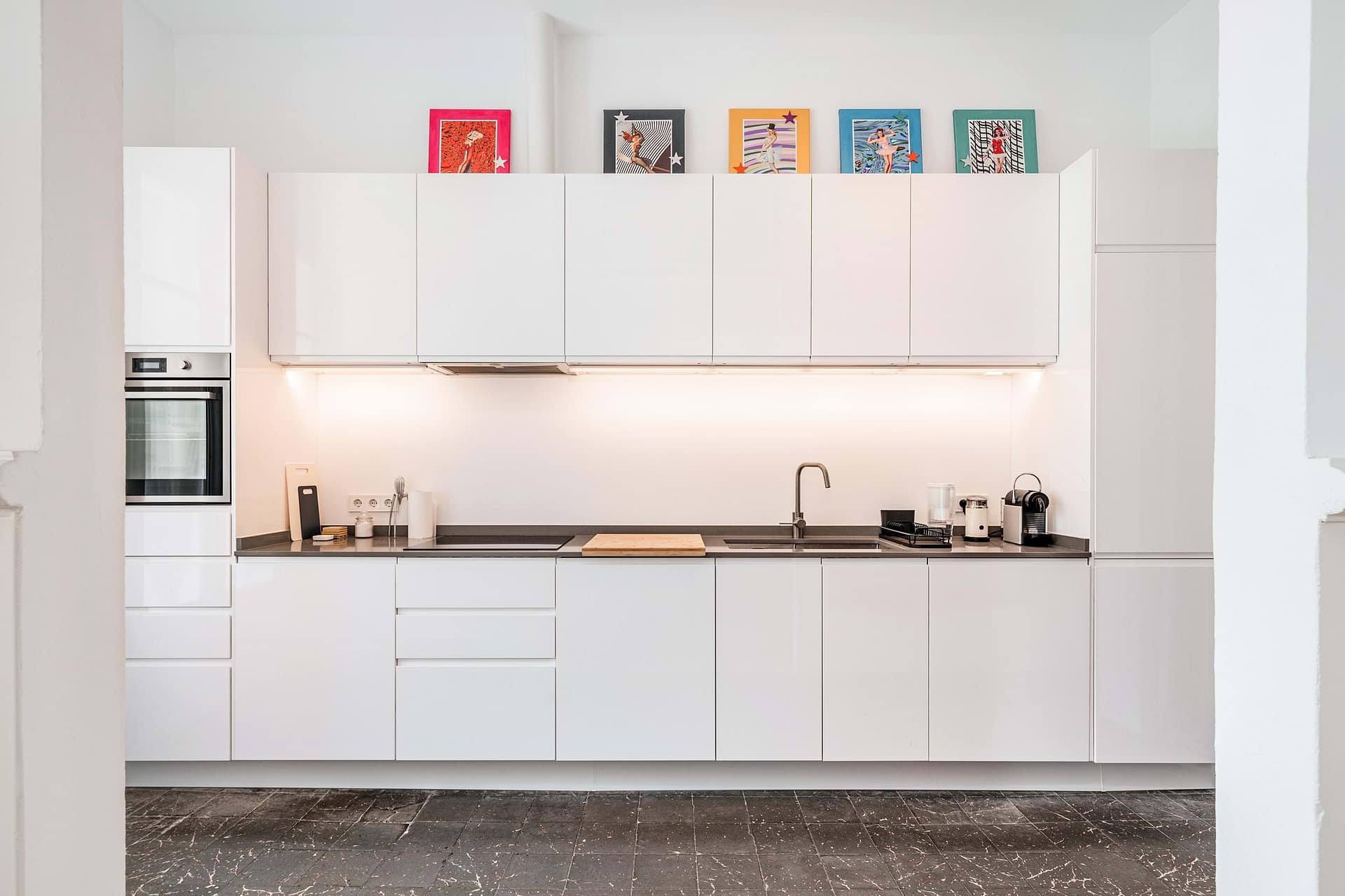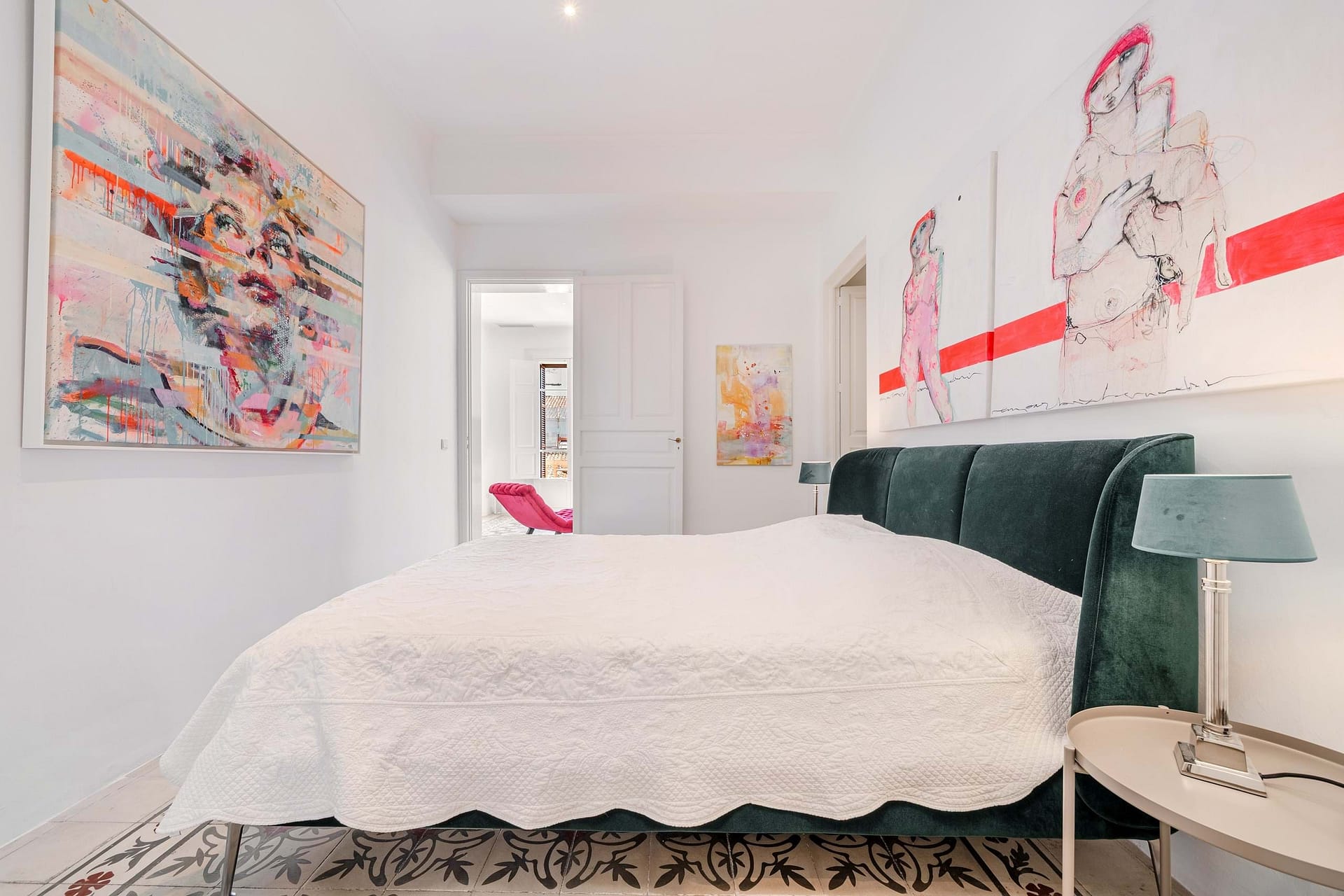 The property features three bedrooms and two bathrooms, one of which is en suite. Highlights include the original preserved, vector-patterned tiles, high ceilings, and consistently white walls with stucco detailing, which give the space an elegant and airy atmosphere.