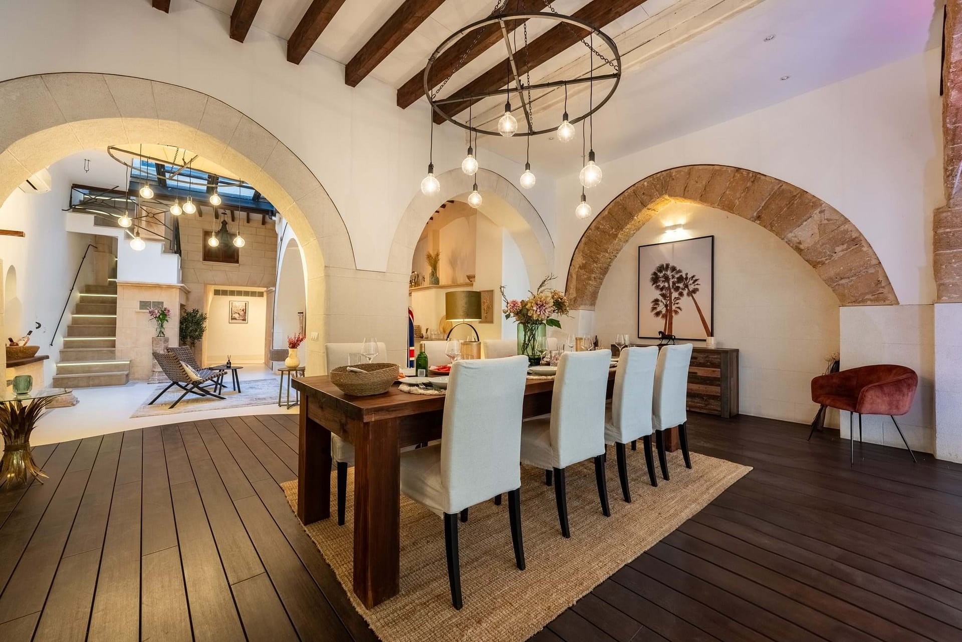 This exceptional townhouse is tucked away on a quiet side street in the historic center of Palma de Mallorca, just steps from Plaza Raimundo, the Palma Suites Hotel, and some of the citys best restaurants and boutiques. Despite its central location, the homes peaceful indoor atmosphere feels like a quiet retreat amidst a bustling city.