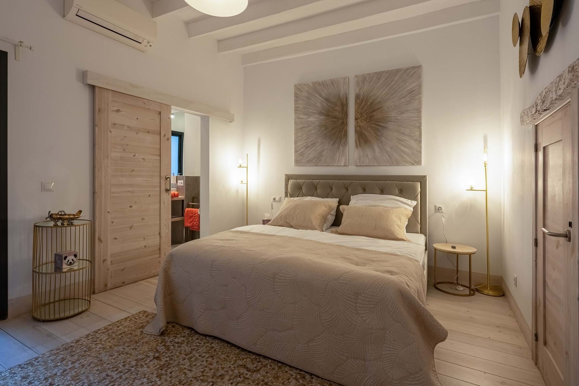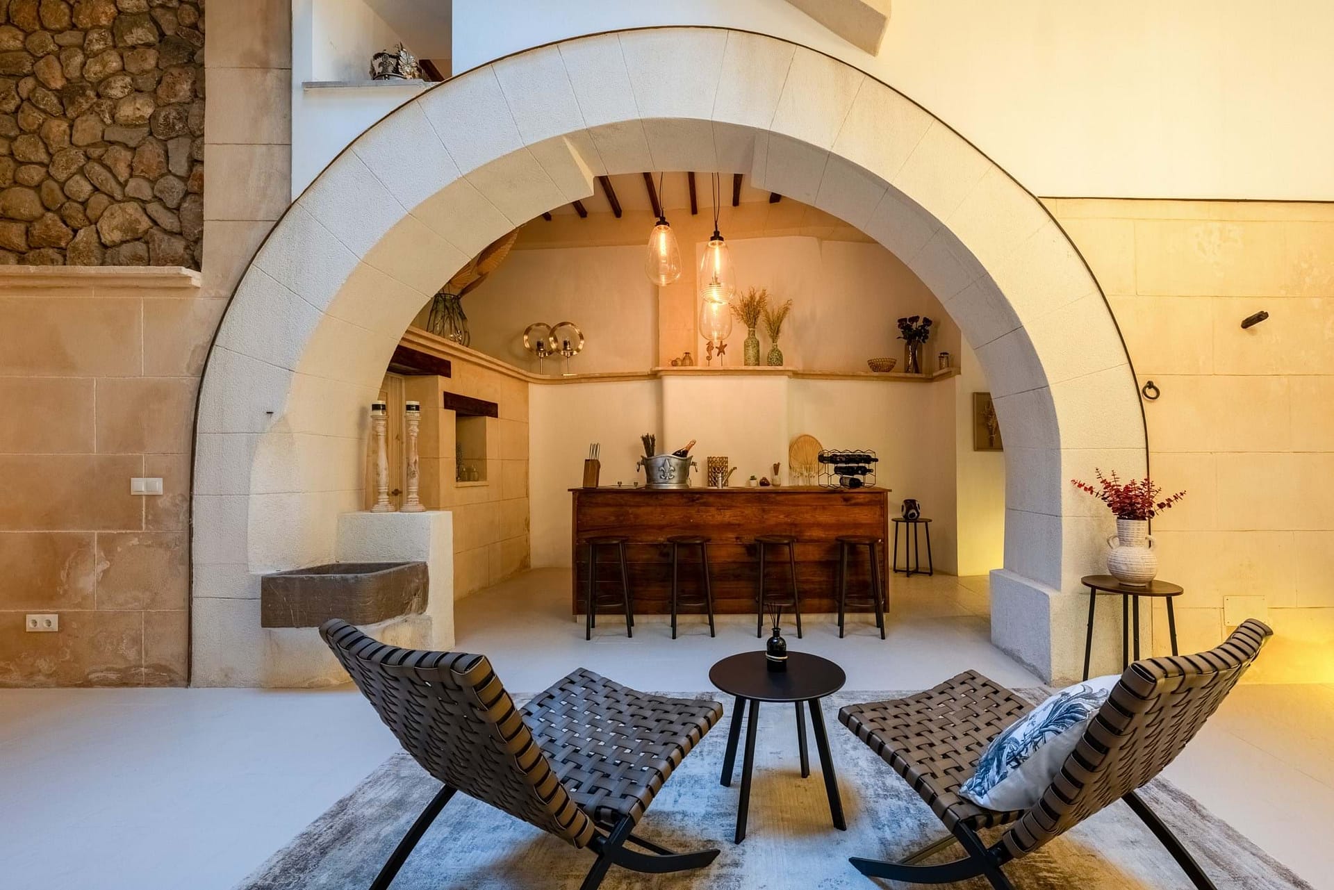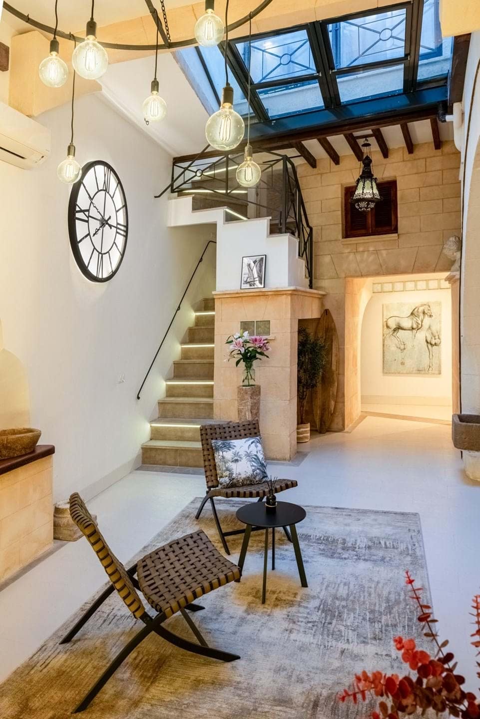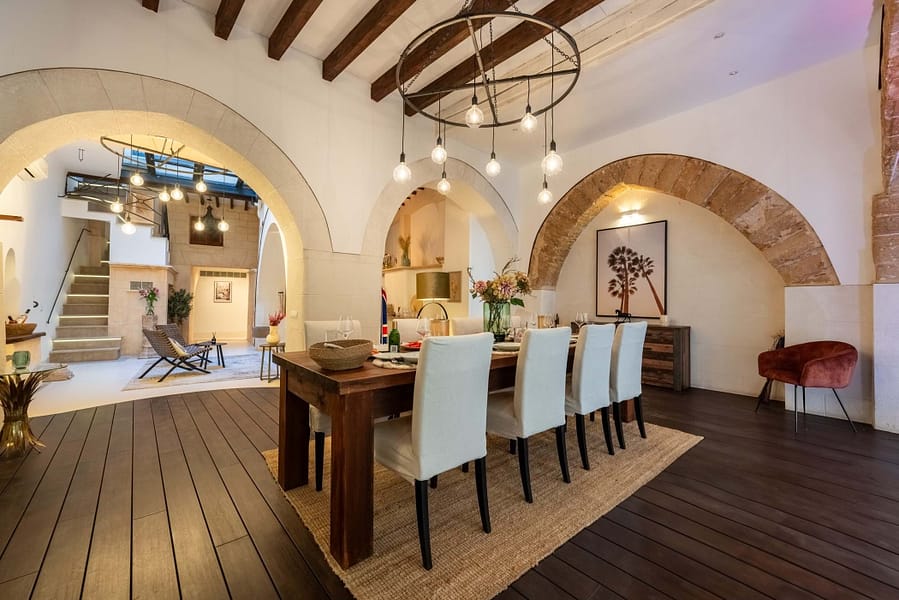 Spread over four floors, the property has been carefully renovates with great attention to detail. Traditional Mallorcan architecture is fluidly combines with modern comforts. High-quality natural materials, exposed wooden beams, original Marés stone arches, and elegant hardwood floors give the house a warm and refined essence. A private elevator conveniently connects all levels- from the ground floor entrance to the sunlit top floor.