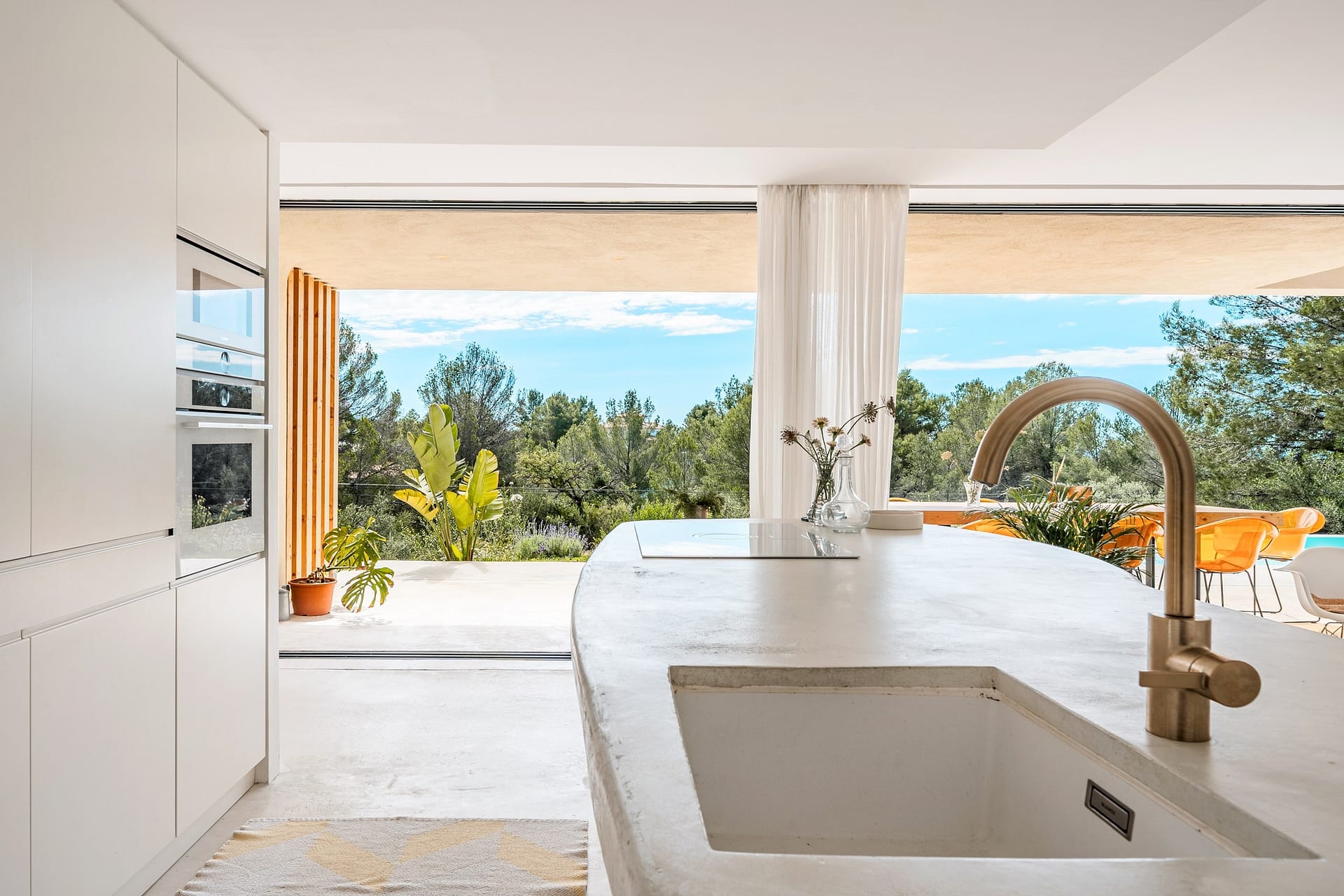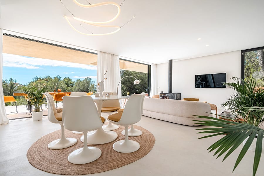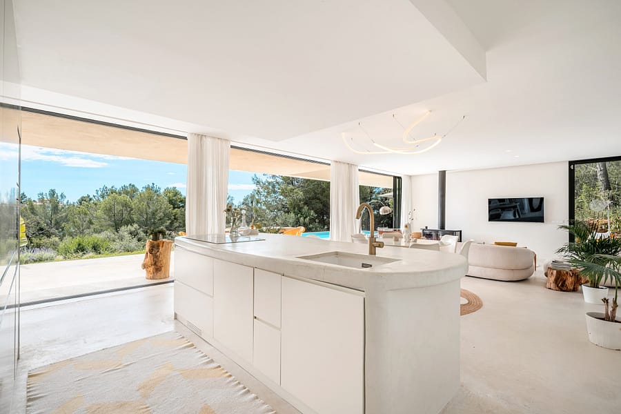 The heart of the property is the spacious, open concept living and dining area, which is given a cozy atmosphere by a stylish wood burning stove. Floor to ceiling windows flood the room with natural light and can be fully opened, creating a seamless connection between the indoor and outdoor spaces, ideal for enjoying the Mediterranean lifestyle to the fullest.