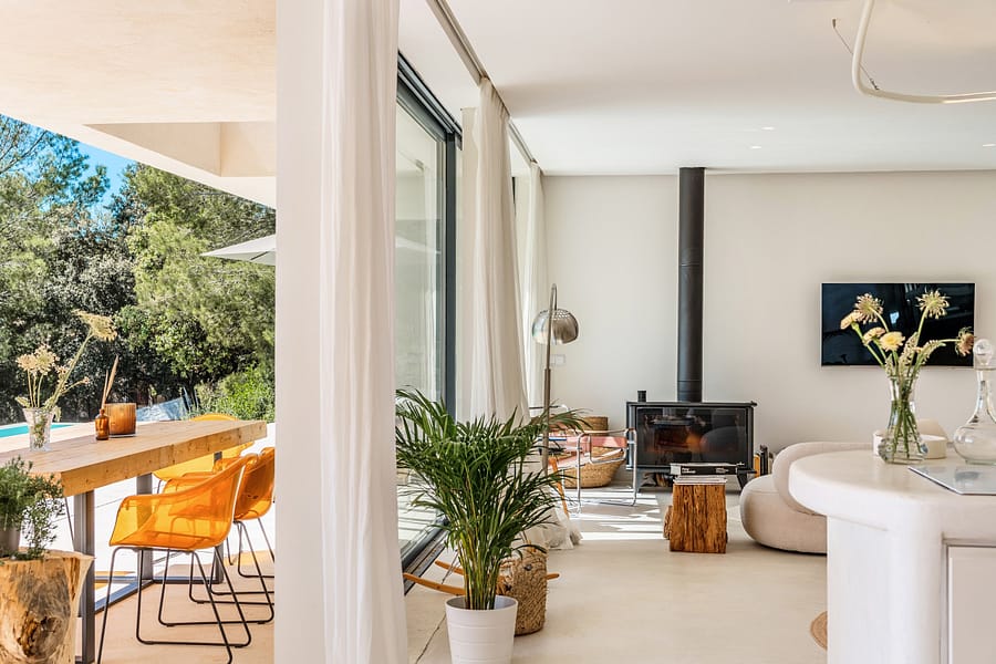 The heart of the property is the spacious, open concept living and dining area, which is given a cozy atmosphere by a stylish wood burning stove. Floor to ceiling windows flood the room with natural light and can be fully opened, creating a seamless connection between the indoor and outdoor spaces, ideal for enjoying the Mediterranean lifestyle to the fullest.