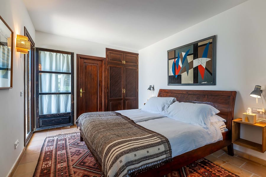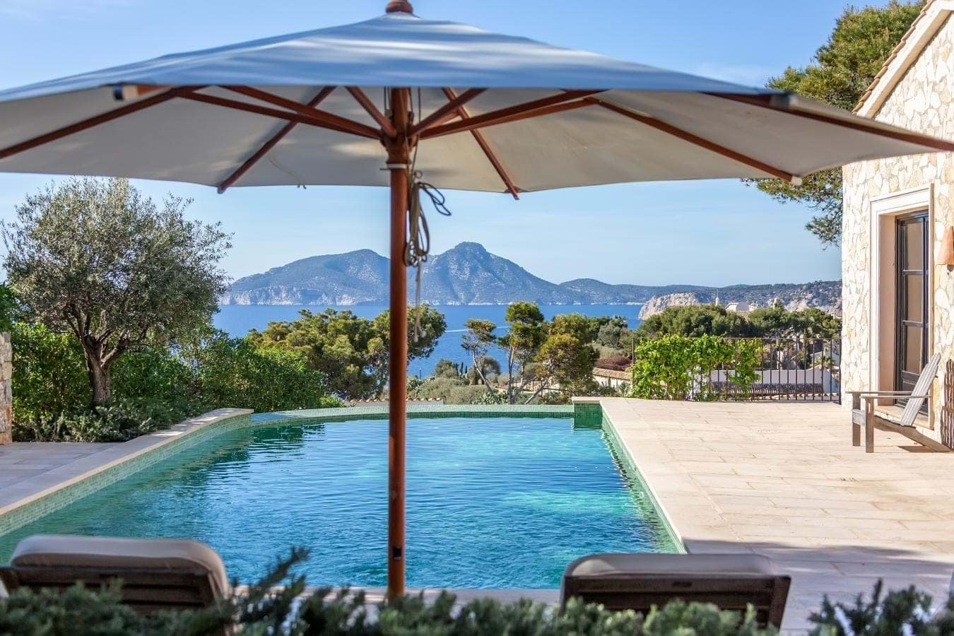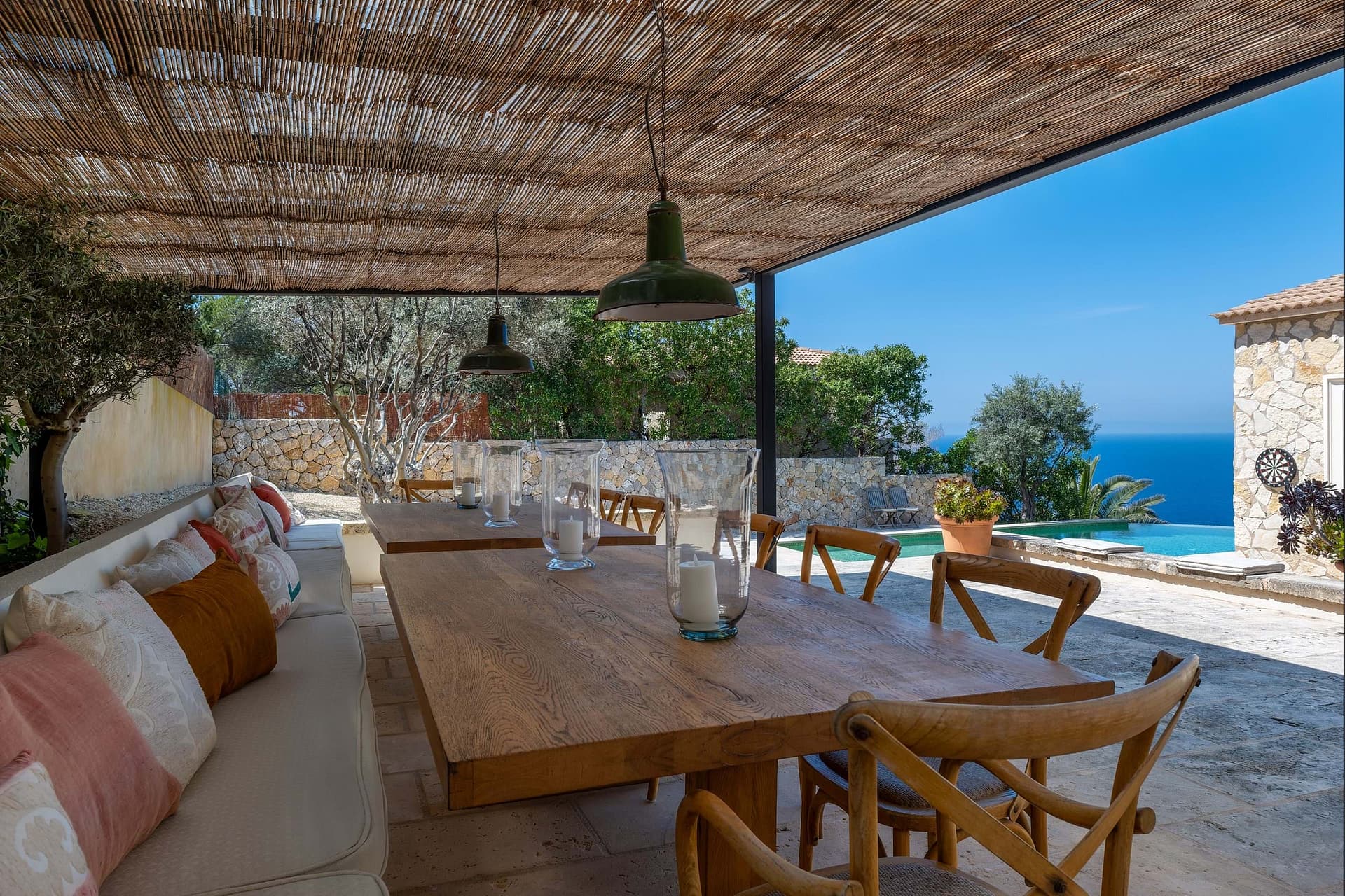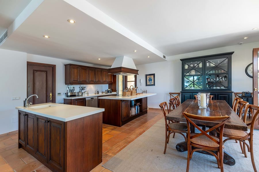 Additional features include a fully equipped kitchen, open-plan living and dining spaces, electric underfloor heating, and air conditioning throughout for year-round comfort. The home also offers several outdoor dining areas to enjoy the Mediterranean island lifestyle.