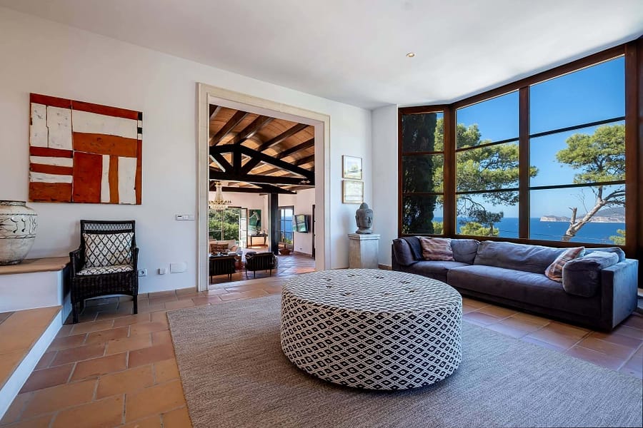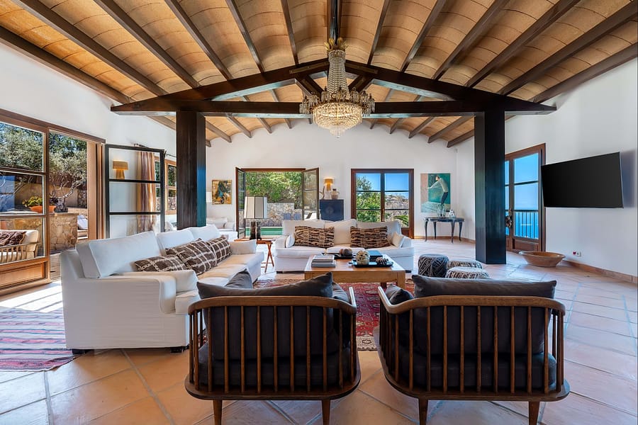 The architecture freely blends indoor and outdoor living, with large windows and multiple terraces that frame panoramic sea views and fill the interiors with natural light. The homes elegant stone facade and the exposed natural-toned wood beams and ceiling perfectly achieve this cozy Mediterranean vibe.