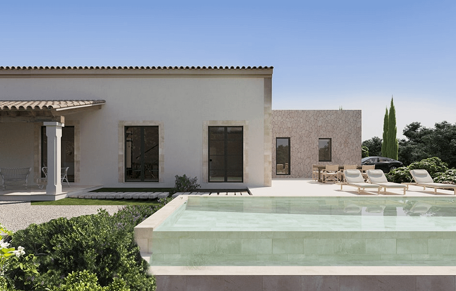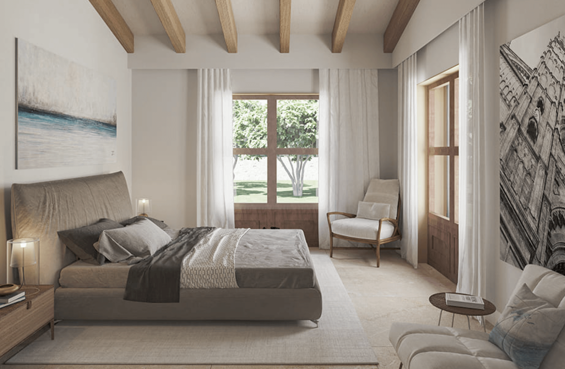 Discover this beautiful finca located in the heart of Mallorca’s countryside. The property is spread over a sprawling 17,030 square meters estate and offers a perfect blend of rustic charm and luxurious finishes. The iconic marés stone and a striking natural stone façade add to its elegance. The finca is designed to accommodate 5 to 6 bedrooms, with 3 bedrooms having their own private ensuite bathrooms, ensuring both privacy and comfort. The centerpiece of Algaida I is the expansive, double-height open-plan living and dining area, complete with a stylish gallery and a state-of-the-art gym. The semi-covered pool terrace and the solarium on the upper floor provide serene havens for basking in the glorious Mallorcan sunshine. The finca offers panoramic views of the surrounding countryside, and the beautiful garden is highlighted by a small vineyard. The centre of Algaida is just a few minutes walk away. Palma airport can be reached in 15 minutes by car, while the centre of Palma is just a 20-minute drive away.