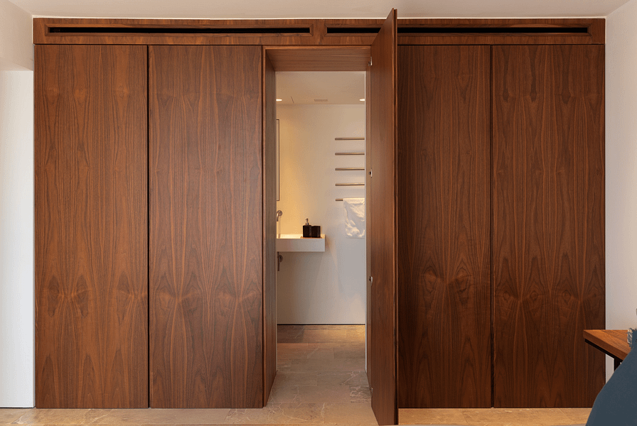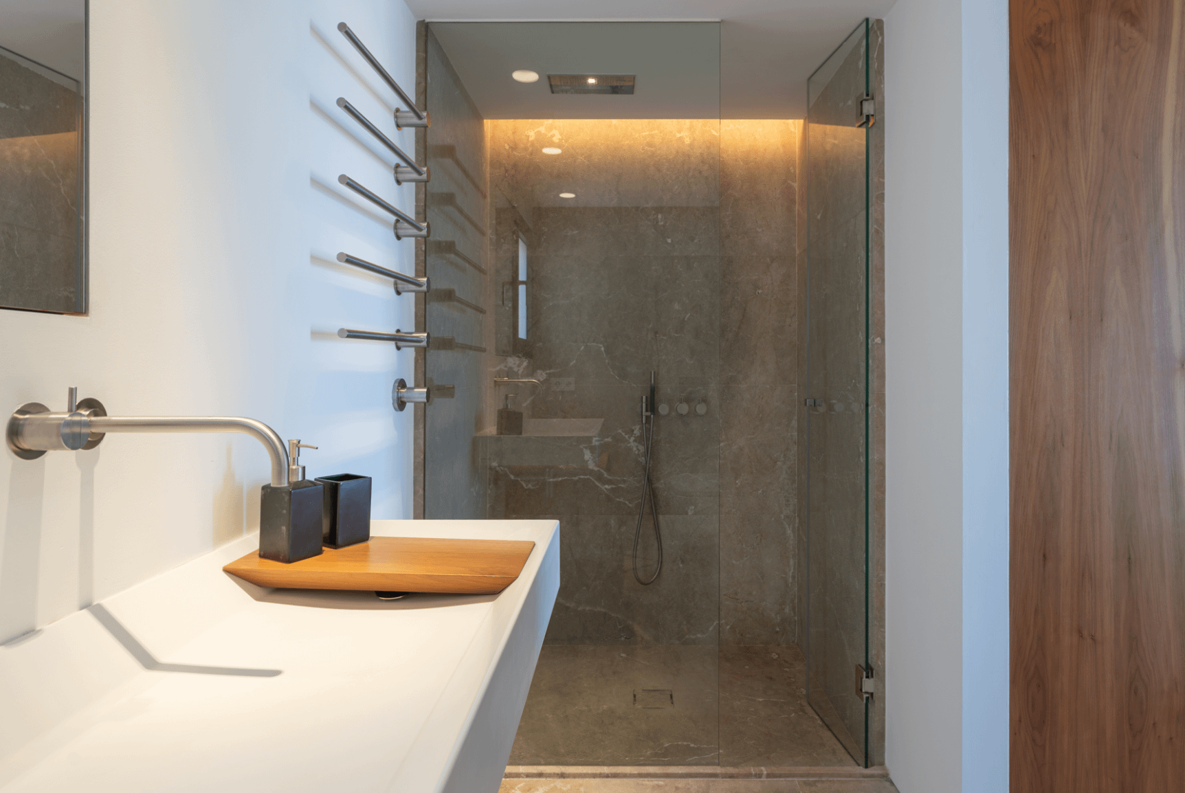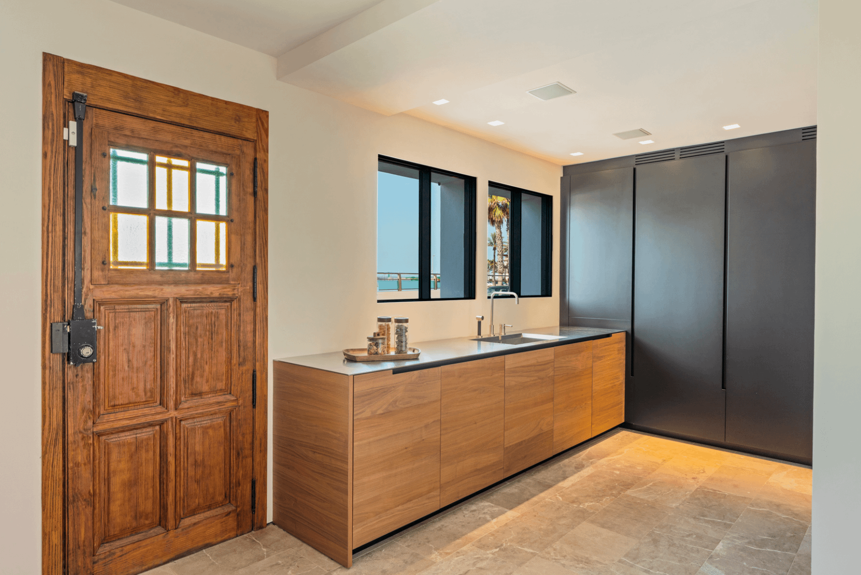 A standout element is the custom-made kitchen crafted from stainless steel and solid walnut wood, combining high-end design with functionality. The property is offered fully furnished.