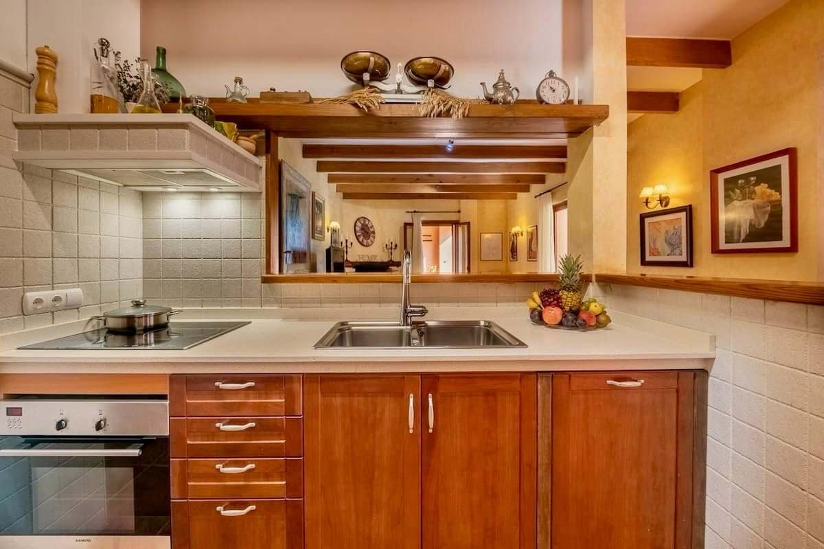 The elegant home is distributed over two comfortable levels, featuring three bedrooms and two bathrooms, including a main suite with a dressing room. The bright living and dining rooms connect seamlessly to a fully equipped modern kitchen, creating a warm and welcoming atmosphere with high ceilings and exposed wooden beams. The outdoor space is truly exceptional, crowned by a spectacular infinity pool that appears to merge with the horizon. Multiple terraces, including a large open terrace and partially covered areas, are perfect for relaxing, entertaining, or taking in the magnificent, breathtaking sea views and unforgettable sunsets.