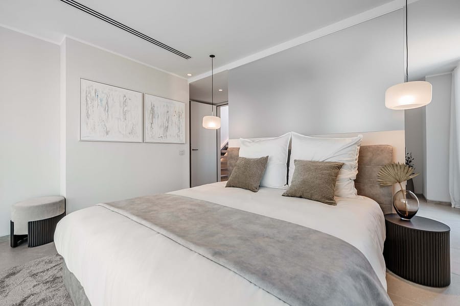 Inside is an integrated layout with three bedrooms and three bathrooms across two levels. The open-plan living and dining area cohesively stands with a designer kitchen, with a cooking island and high-end appliances. The substantial windows create an influx of natural light and panoramas of the sea, the city with its iconic cathedral, and the scenic mountains.